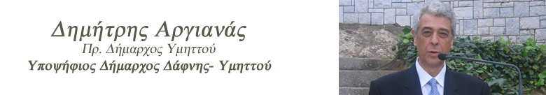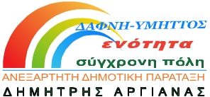 Η δημοτική παράταξη «ΔΑΦΝΗ-ΥΜΗΤΤΟΣ ενότητα, σύγχρονη πόλη» ΔΗΜΗΤΡΗΣ ΑΡΓΙΑΝΑΣ , που διοίκησε τον Δήμο Υμηττού επί σειρά ετών έχοντας αποδείξει ότι έχει ως κύριο κεντρικό άξονα της πολιτικής της τη Χρηστή Διοίκηση, την Διαφάνεια παντού, την Κοινωνική Δικαιοσύνη, την Αξιοκρατία και την Αλληλεγγύη,
